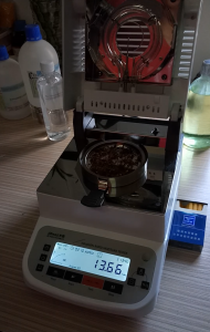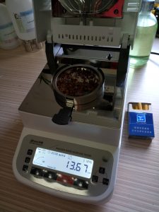 為了得到更精確穩(wěn)定的數(shù)據(jù)結(jié)果,在進行第二次測試過程前先等待煙絲水分儀降溫,待儀器本身溫度降至40度以下時,同樣取6克煙絲細條于不銹鋼托盤中,將煙絲細條平鋪均勻,這次我們把溫度設(shè)定在135℃,按“START”鍵開始測試,2分10秒后檢測結(jié)束,檢測數(shù)據(jù)顯示13.66%;