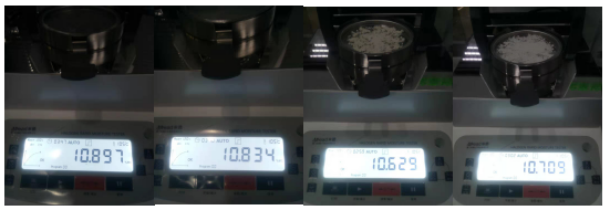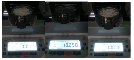 3.用實驗勺取6.643克重的氟化鈣礦粉(A3樣品)均勻鋪在樣品盤上,設置好合適的溫度后蓋下上蓋,按下“START”鍵開始測試;蜂鳴兩聲后,儀器自動停機,測試結束,可在液晶顯示屏查看測試后氟化鈣礦粉的水含量為10.011%;