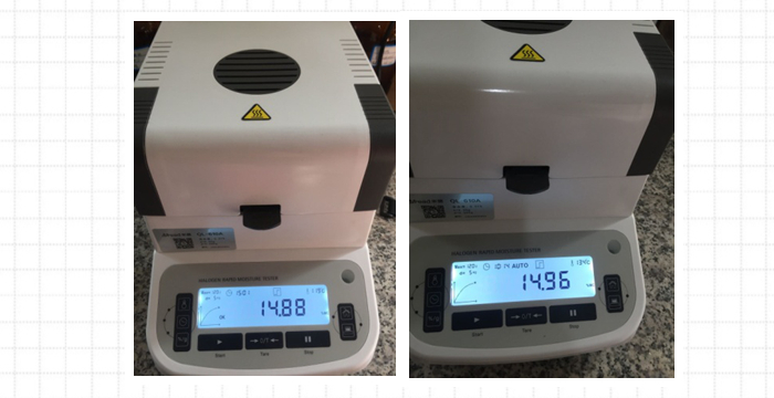 4、測(cè)試結(jié)束后得出第二組數(shù)據(jù),顯示樣品的水分含量為14.96%;數(shù)據(jù)基本相同誤差僅為0.08%,表示測(cè)試結(jié)果可靠,可重復(fù)性好。