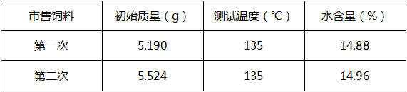 3、復(fù)位儀器,待儀器冷卻至40℃以下后,再取5.524g左右飼料均勻鋪在樣品盤上,重復(fù)上述測(cè)試步驟;