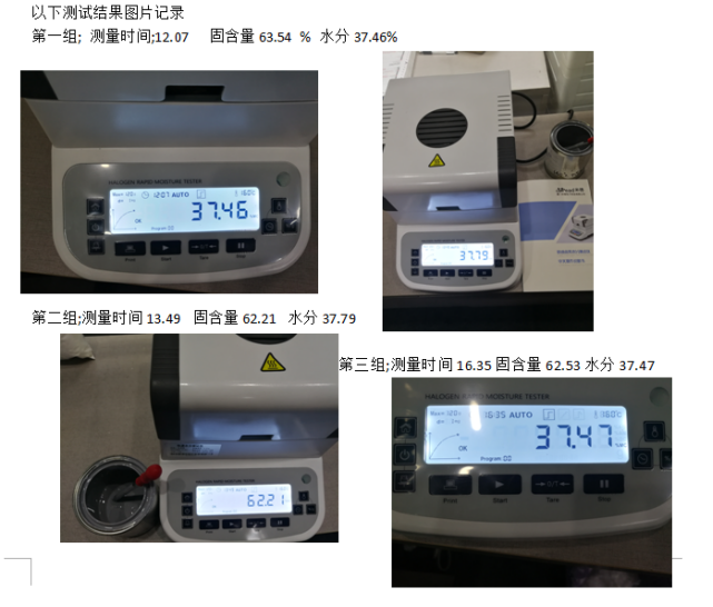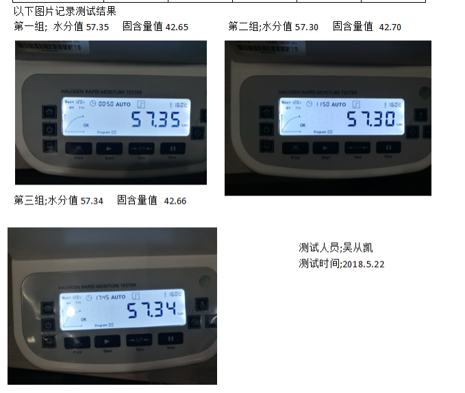 產(chǎn)品狀態(tài); | 重量 | 測試溫度 | 測試時(shí)間 | 固含量結(jié)果 | 水分結(jié)果 |